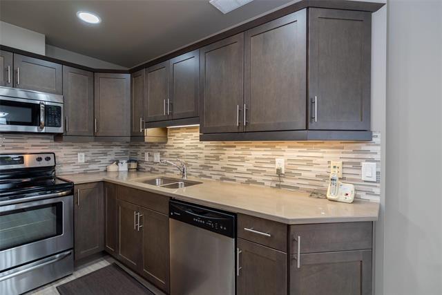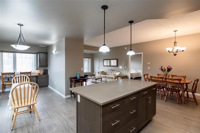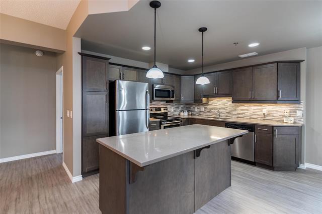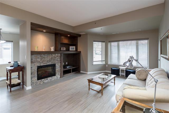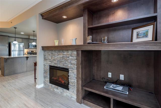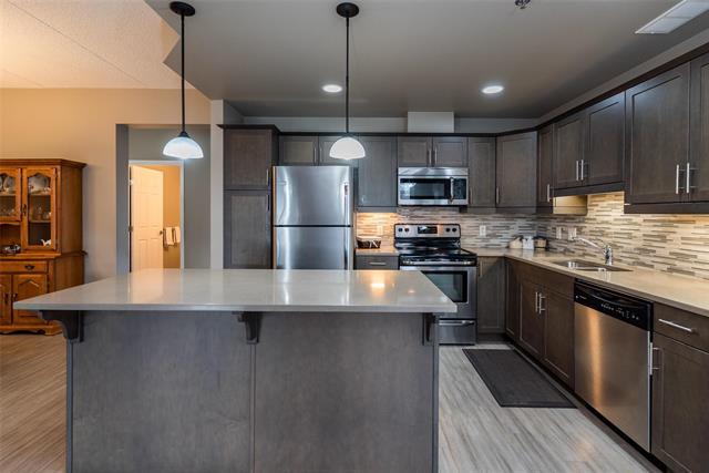 Bright & spacious end-unit in the sought-after Stonecrest complex in Linden Woods built with concrete and steel beam construction. With over 1,400 sq ft, 9' ceilings, and lots of storage, this former show suite has many upgrades & features an inviting layout and great natural light. The island kitchen offers caesarstone counters and maple cabinetry, opening to a warm living area with laminate flooring and a built-in entertainment center with a gas fireplace. Spacious dining room. Handy desk area/office off the kitchen eating area. 2 good size bedrooms, including a generous primary suite with a walk-in closet and dual-sink vanity. Dedicated in suite laundry room. The wrap around balcony is large! The LARGE underground parking stall is a real plus and is located right BELOW the condo itself accessible by taking the nearby stairwell & one outdoor parking stall ALSO included. TWO storage lockers are a HUGE bonus as well !! Stonecrest provides excellent amenities: guest suite, party room, library, gym, games room, carwash, and workshop. On site property manager. A great community, a very well-kept building in a fantastic location, move-in ready and easy to love. Enjoy the convenience of main floor living!