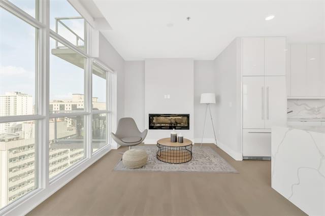 Host in the party room with a 2,364 sq ft terrace, unwind in the lounge with fireplace and pool table, or stay active in the fitness studio. The building also offers a 2-storey lobby, above-grade parkade, car wash, guest suite, and a private lighted path connecting you to the river walk. MEASUREMENTS ARE +/- JOGS.